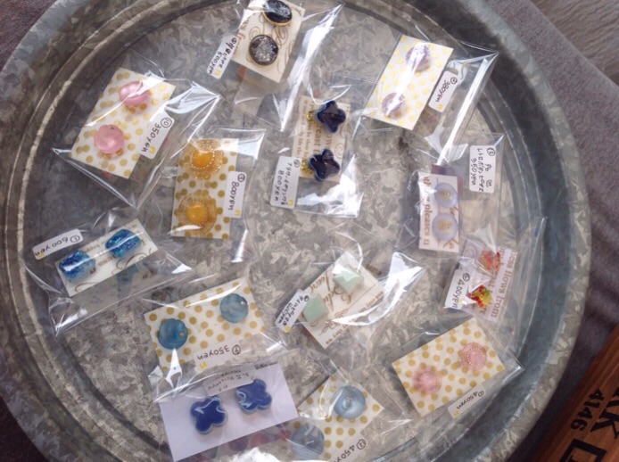 レトロボタンピアスに流行りの宇宙シリーズ、ブローチも残り少ないですがありますよ。