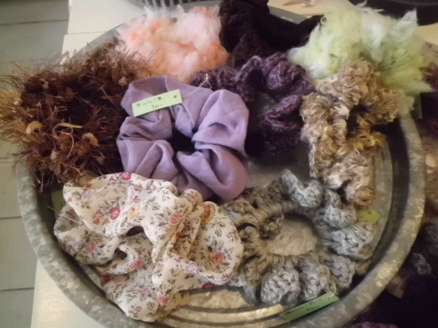 クラフトかごバッグと編みシュシュ・布シュシュです。
